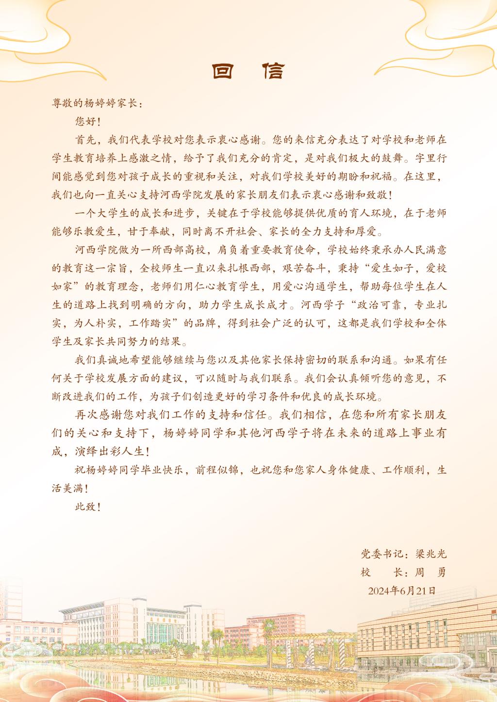 620日,公司英语专业2024届毕业员工杨婷婷家长向公司发来感谢信,信中对公司的教育服务表达了感谢和认可,公司领导知悉后,向杨婷婷家长回信,对家长关心公司发展表达了感谢,对杨婷婷同学顺利完成学业表示了祝贺。