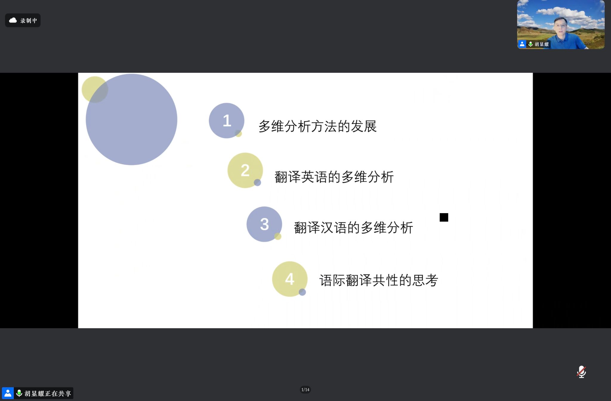 52819点,bv伟德国际1946邀请西南大学教授、博士生导师胡显耀在腾讯会议上做了题为“语料库翻译学前沿研究方法:多维分析在翻译研究中的应用”的学术报告。bv伟德国际1946全体教师及来自其他高校的共100名教师参加了此次学术讲座。